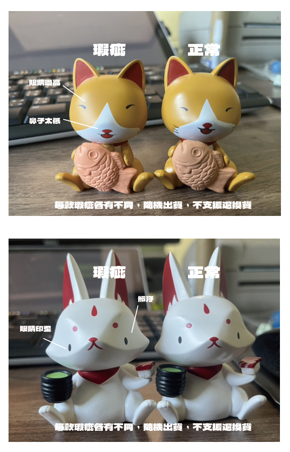 包含五官印刷位移、手塗上色出界(飛邊)、輕微髒污(部分髒污可用酒精擦拭)